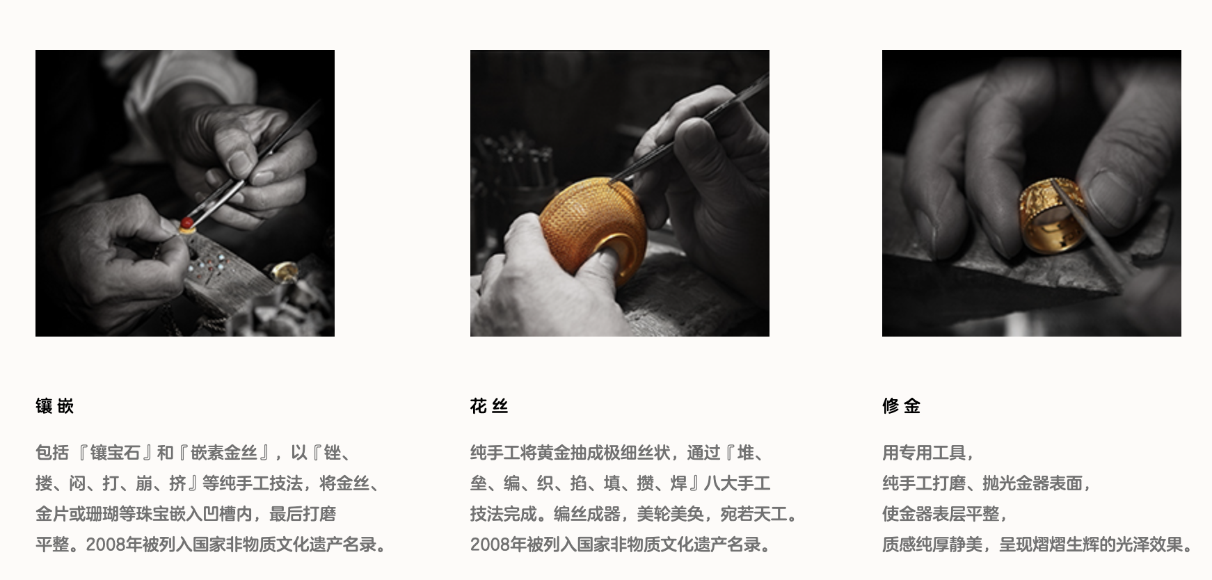 老铺黄金官网对于古法黄金技艺的介绍。截图自老铺黄金官网