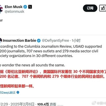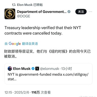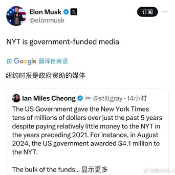 马斯克旗下的效率部也就是网友开玩笑说的狗厂团队,发现美国国际开发署给了著名网络媒体Politico 800万美元补贴;给路透社提供了9147532美元,用于“防御大规模社会欺骗”;过去五年中,美国政府给《纽约时报》数千万美元; 马斯克直接说,纽约时报是美国政府资助的媒体。所以所谓的独立媒体,全部都是拿补贴的!这打脸国内那些灯塔国信徒在吹嘘什么美国媒体是独立自由的神话。